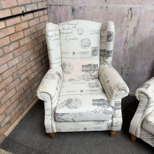 Pair Modern Upholstered Wingback Armchairs Scrolled Arms Postcard Fabric Design