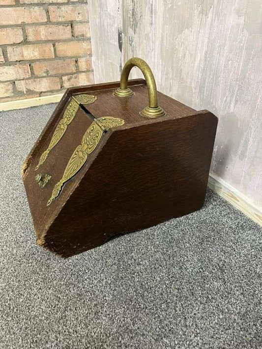Vintage Wood & Brass Coal Scuttle Handle Lift Up Lid Ornate