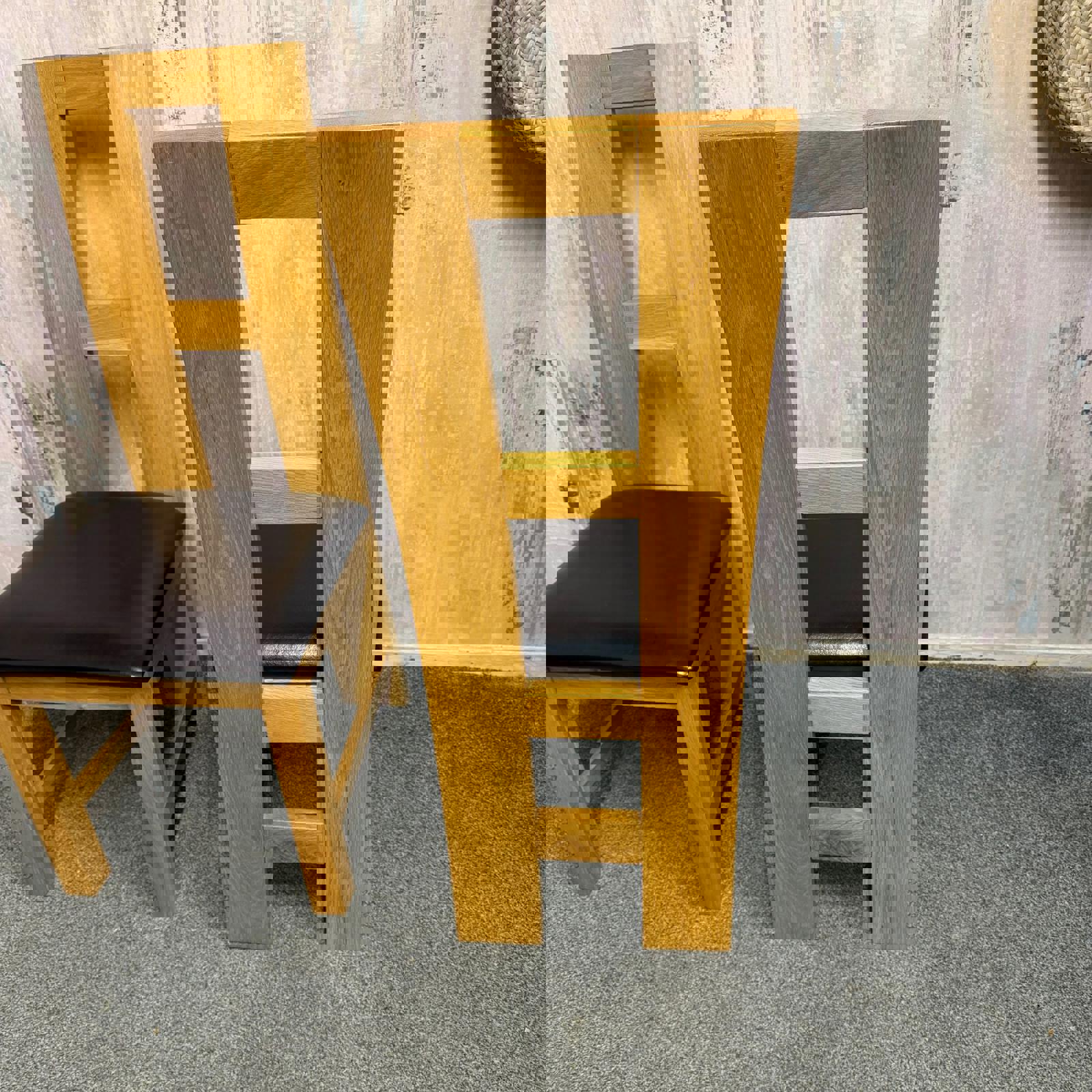 2 solid wood dining chairs with brown leather seats. Open design ladder back design.