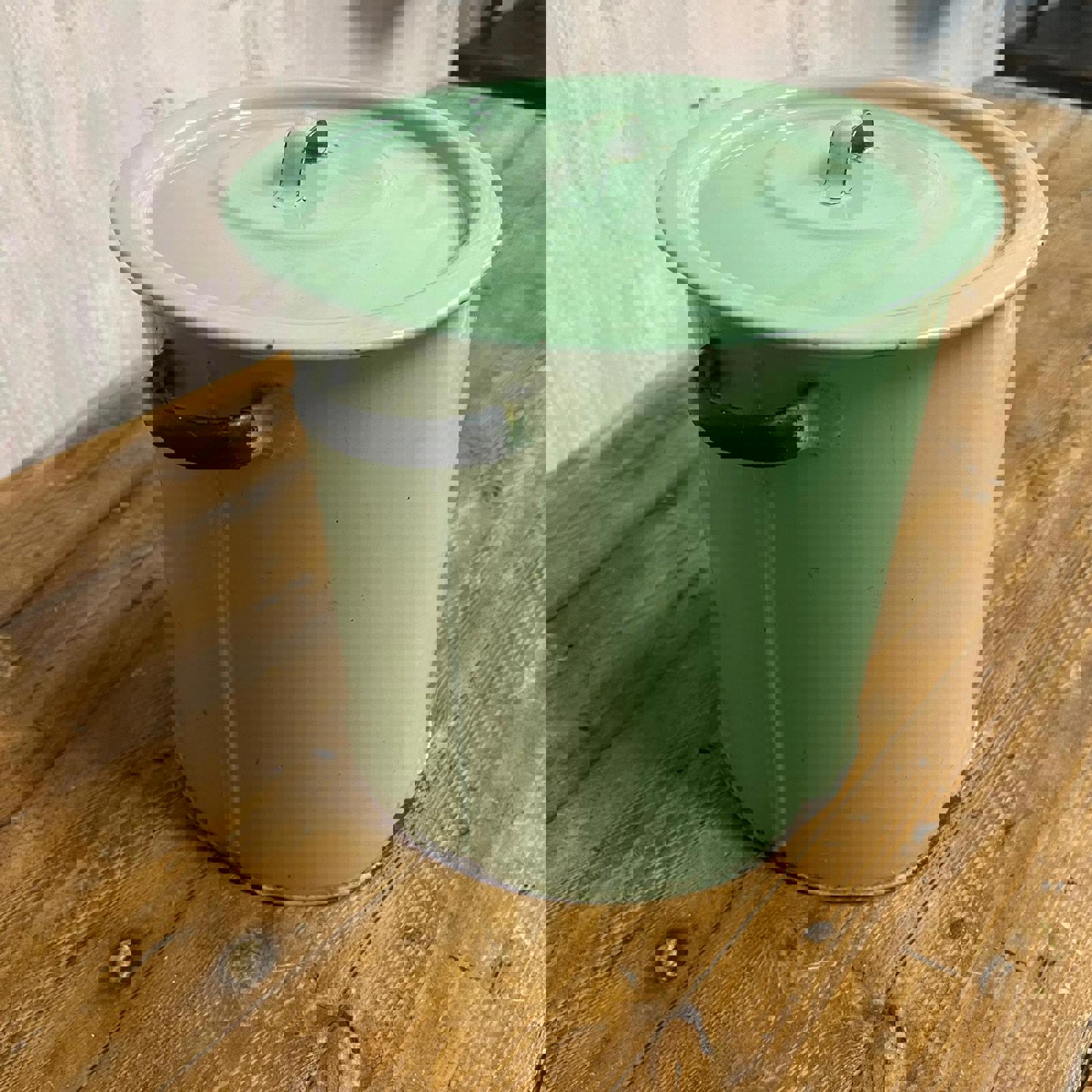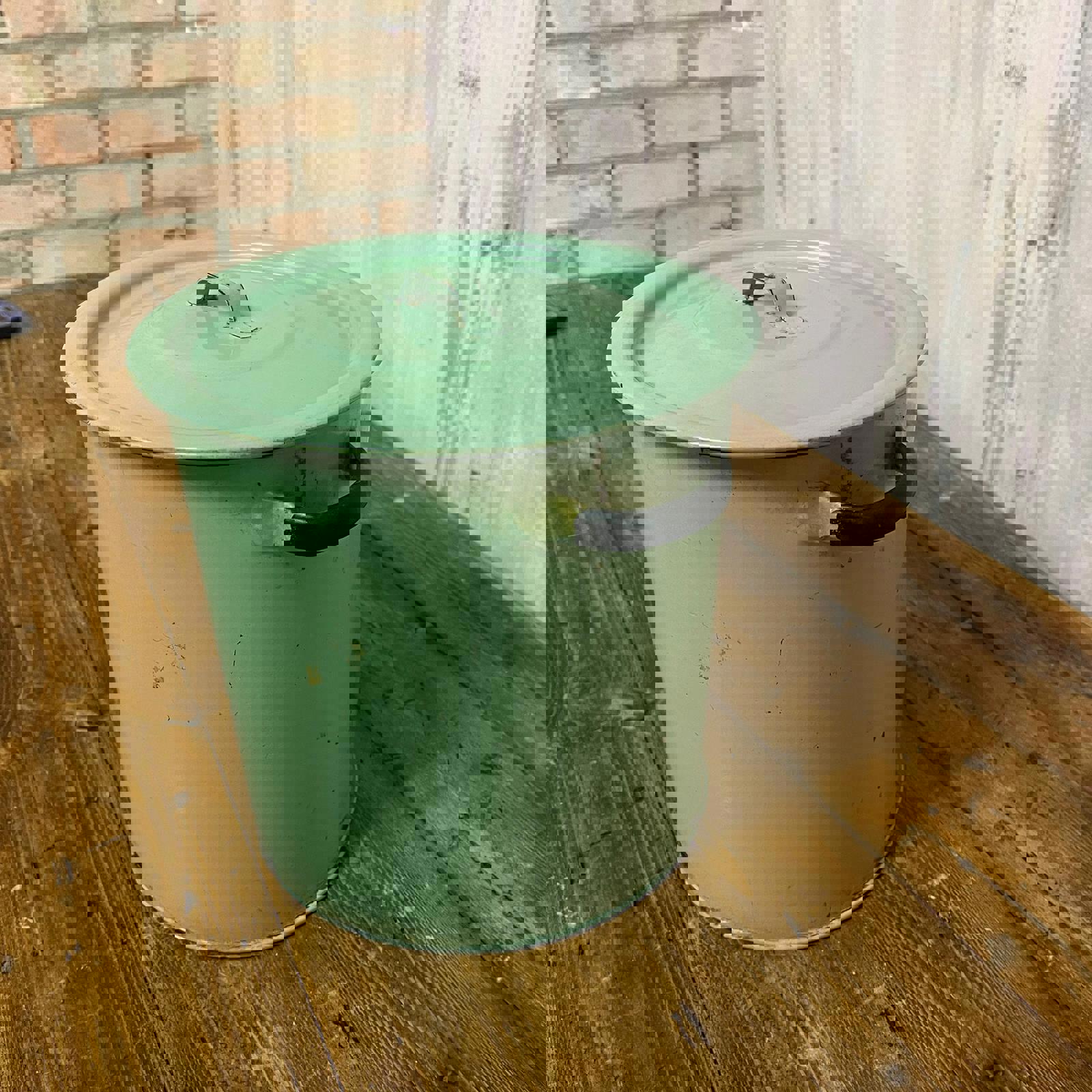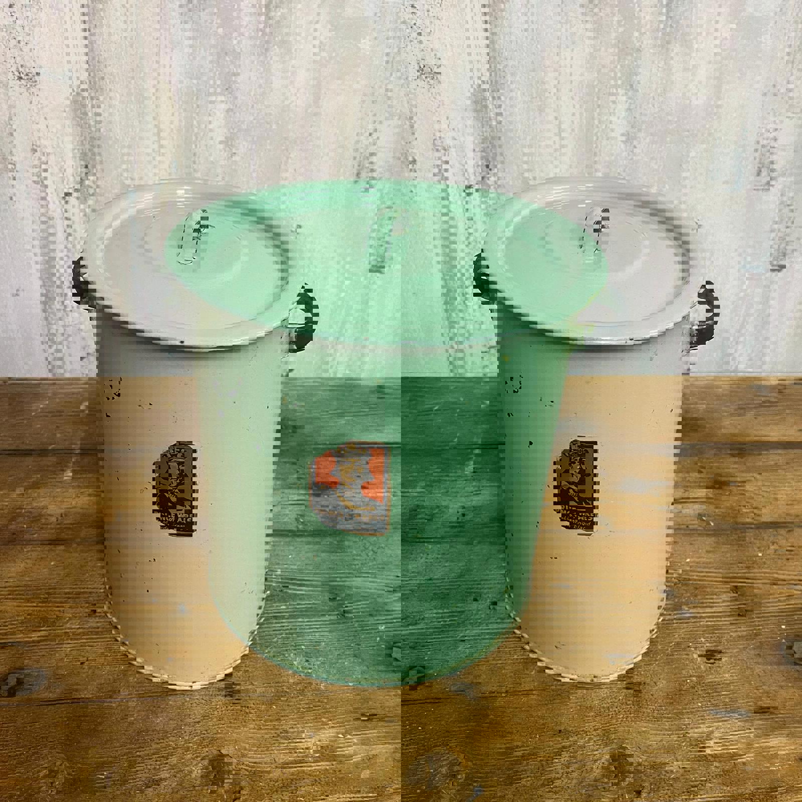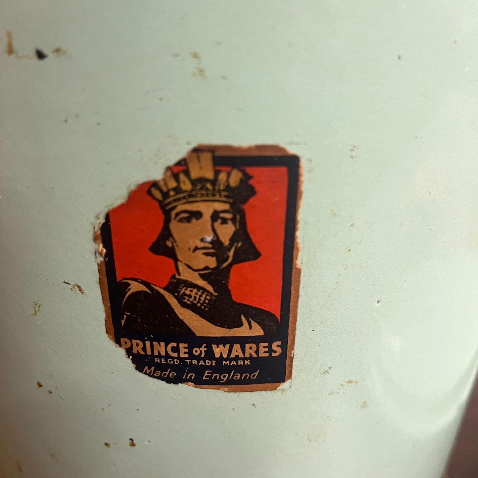 Green enamel tin with lid and handles. Sticker shows "Prince of Wares"
