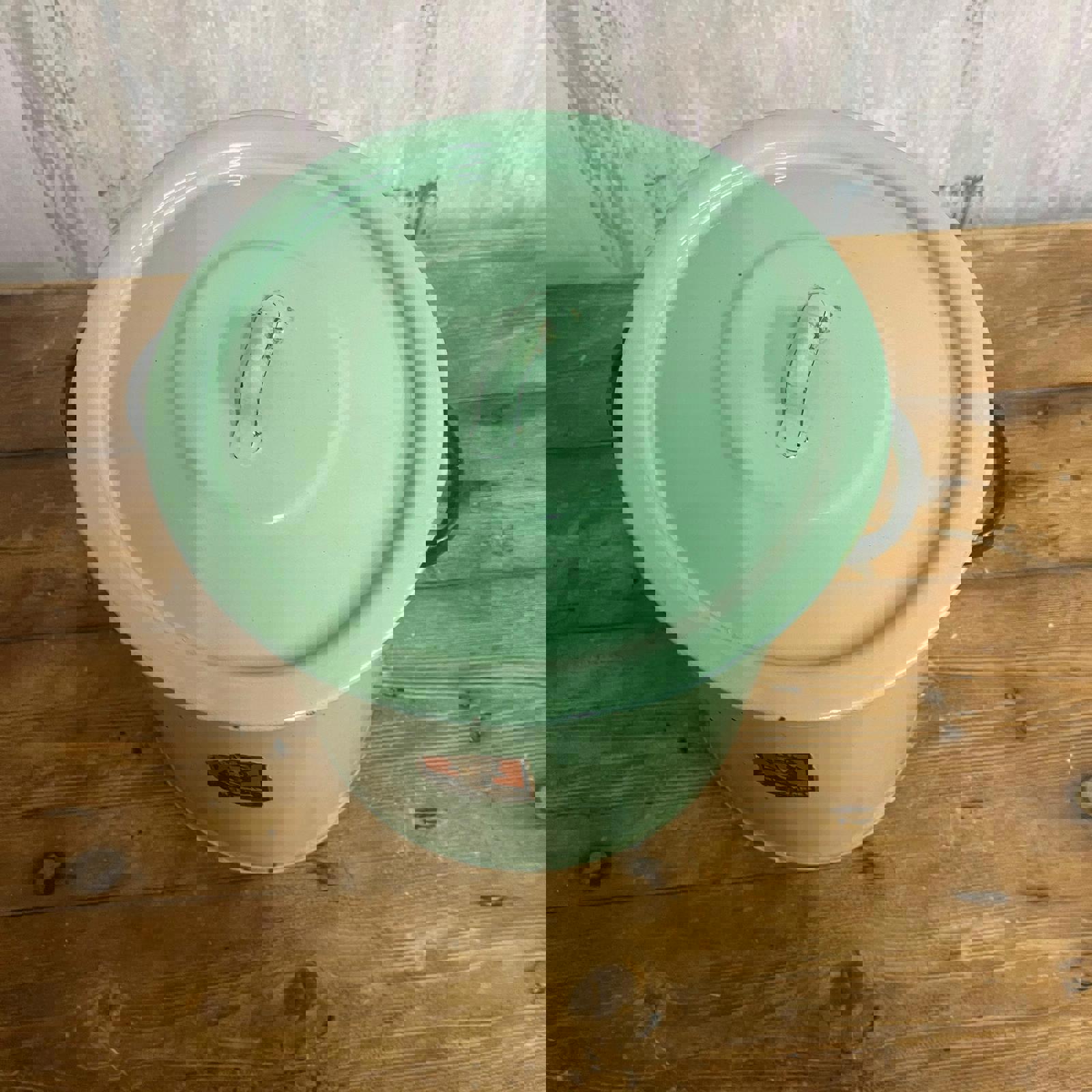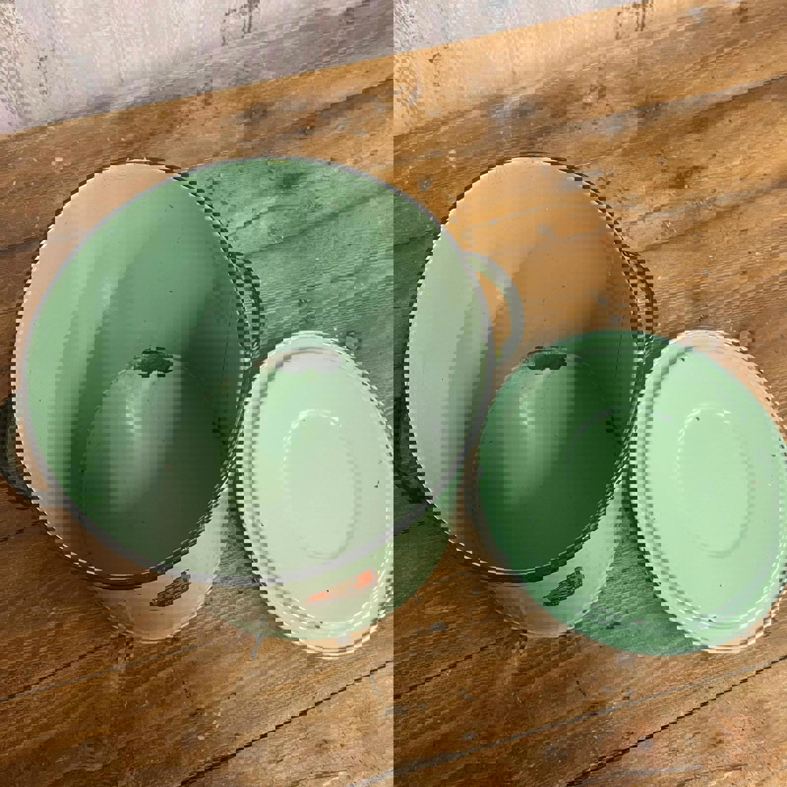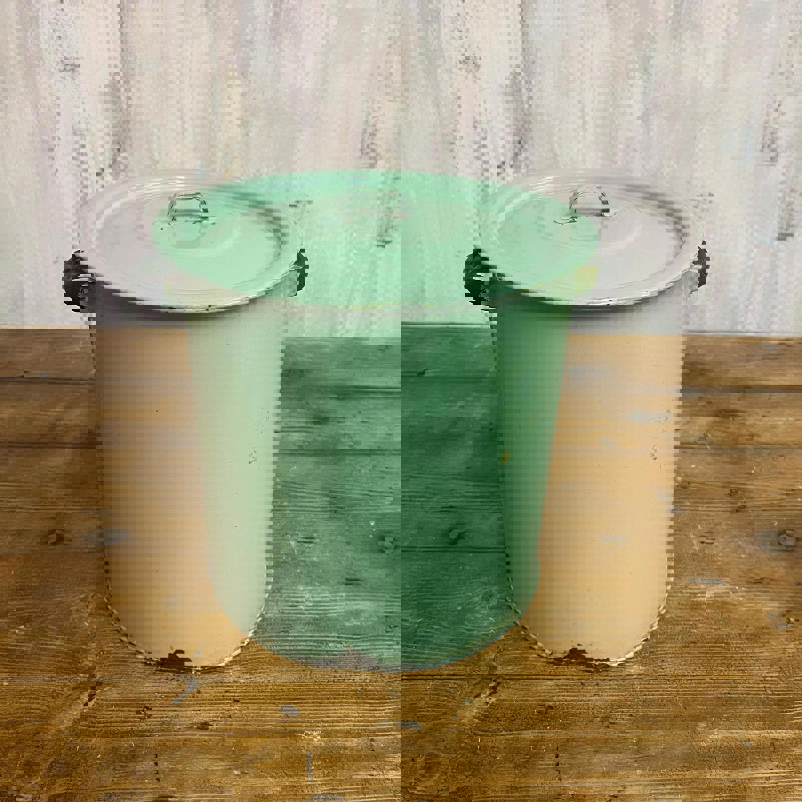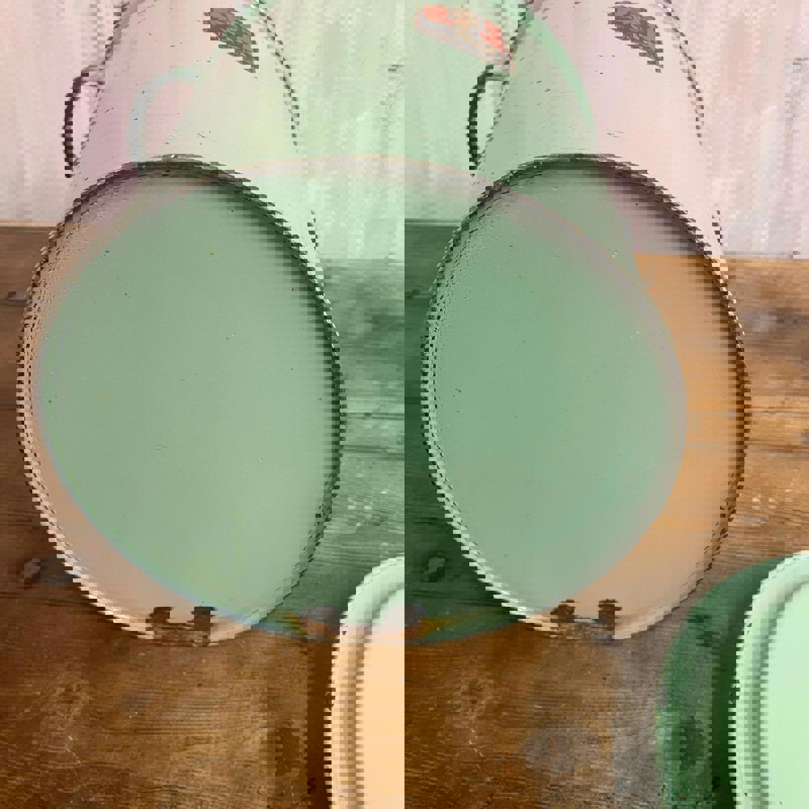 Green enamel tin with lid and handles. Sticker shows "Prince of Wares"