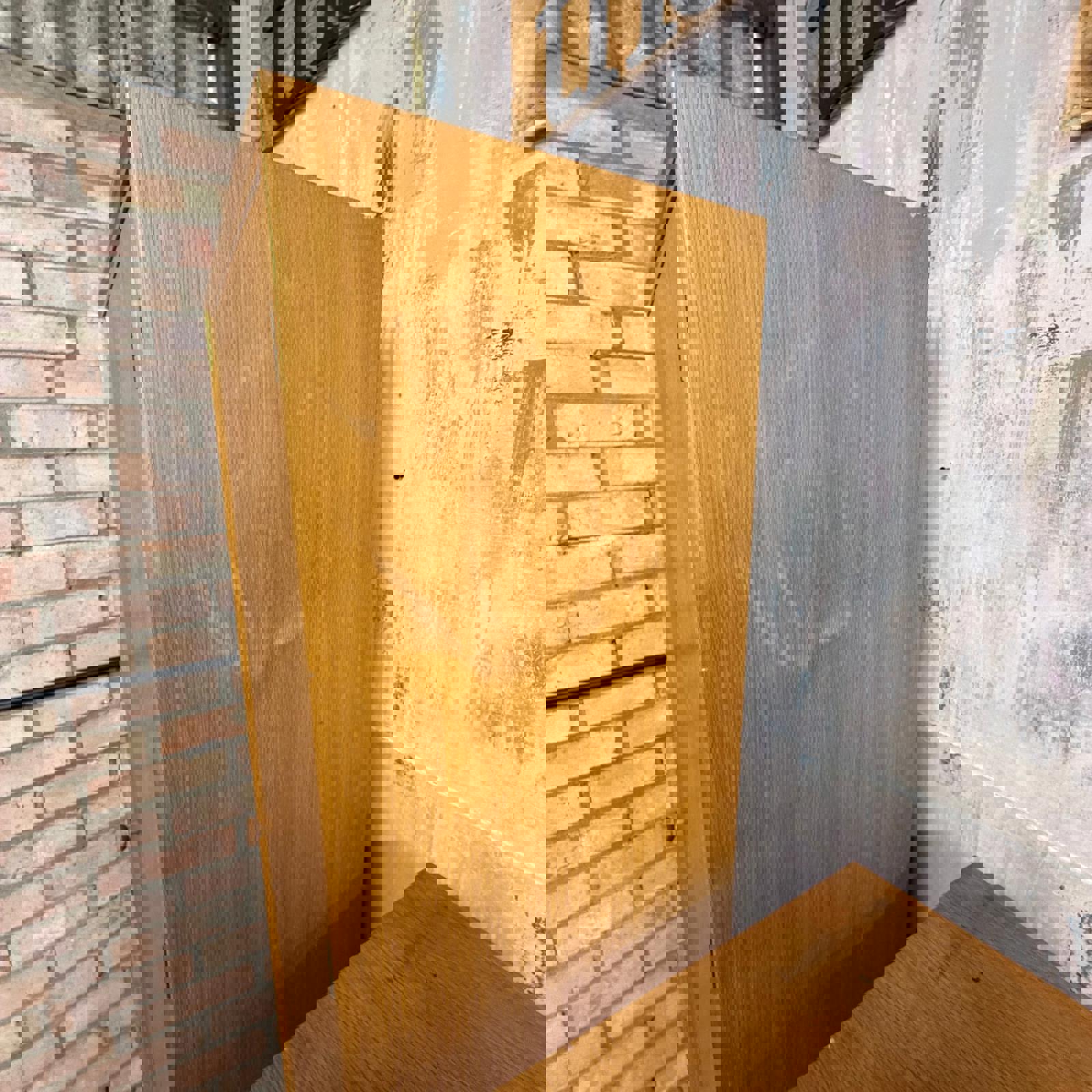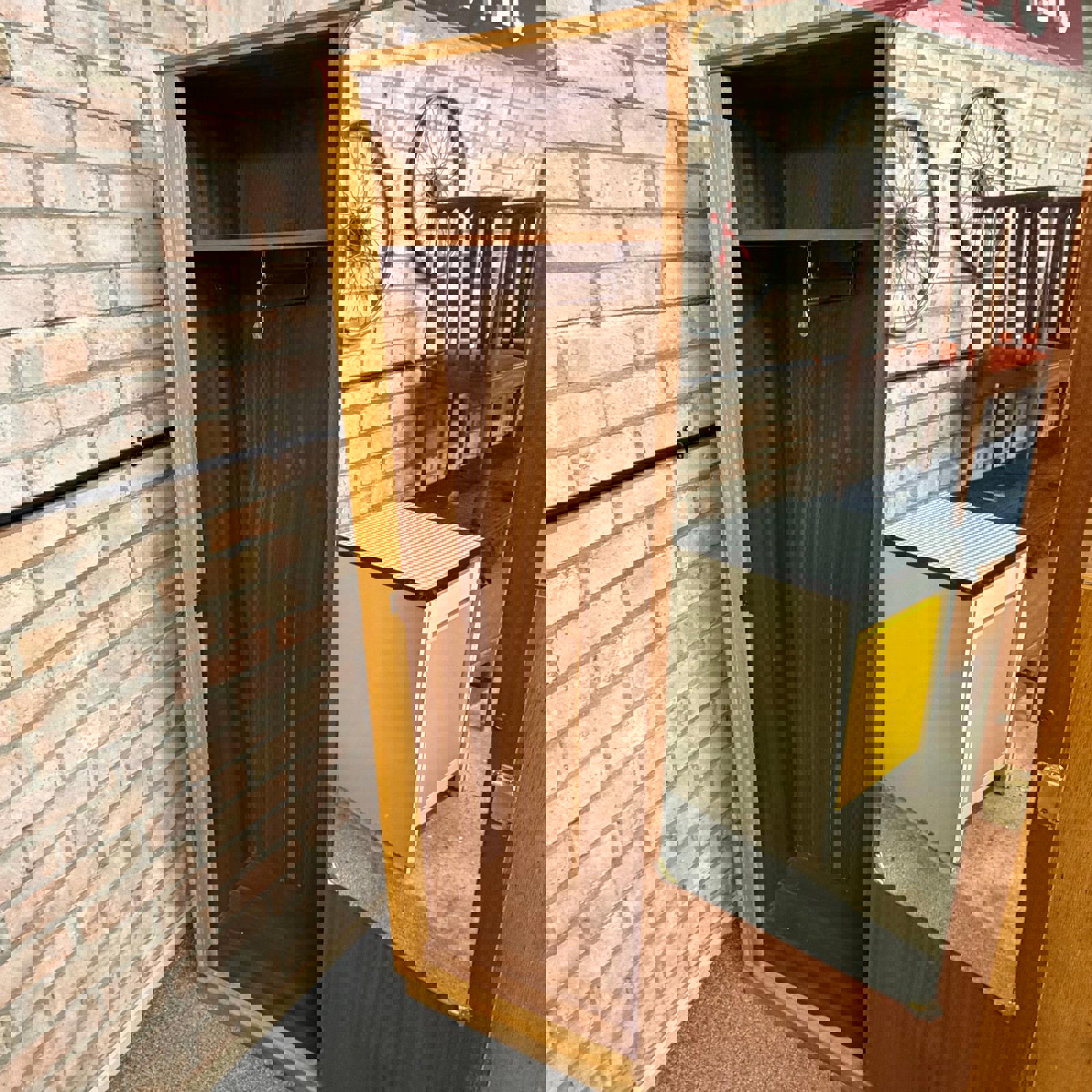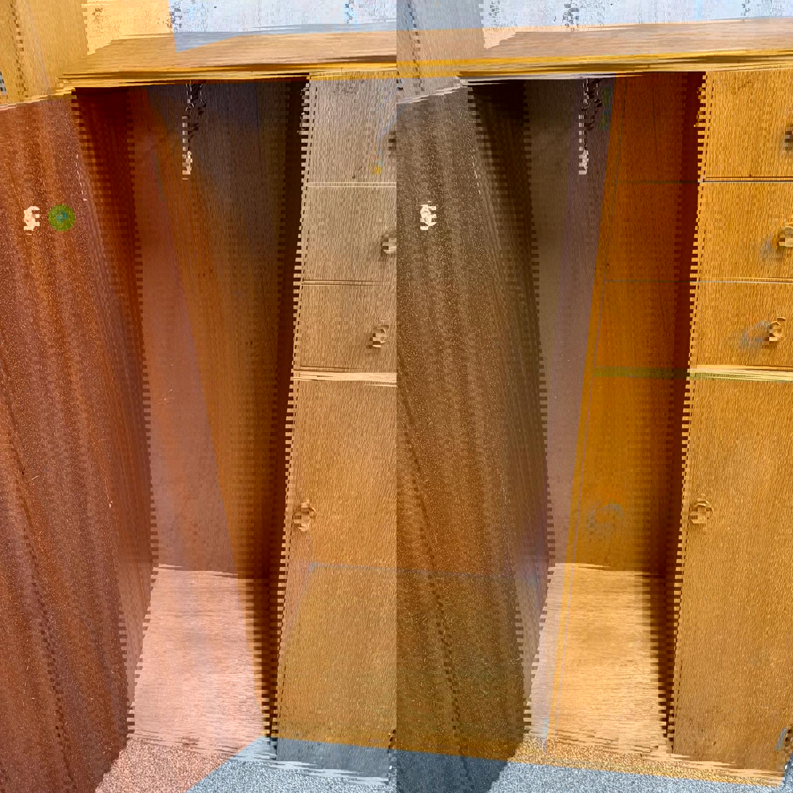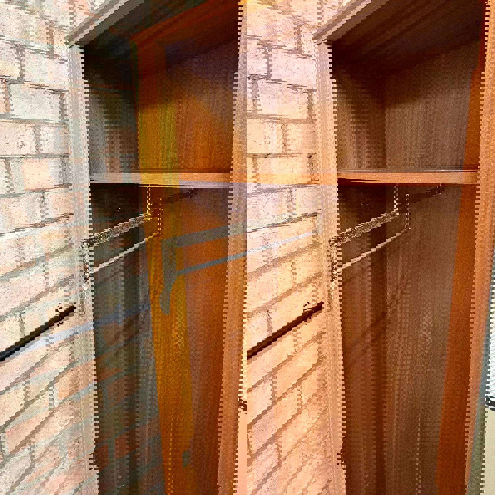 Wardrobe has single door with mirror on inside (maybe not original mirror). There is a sliding rail inside the wardrobe.