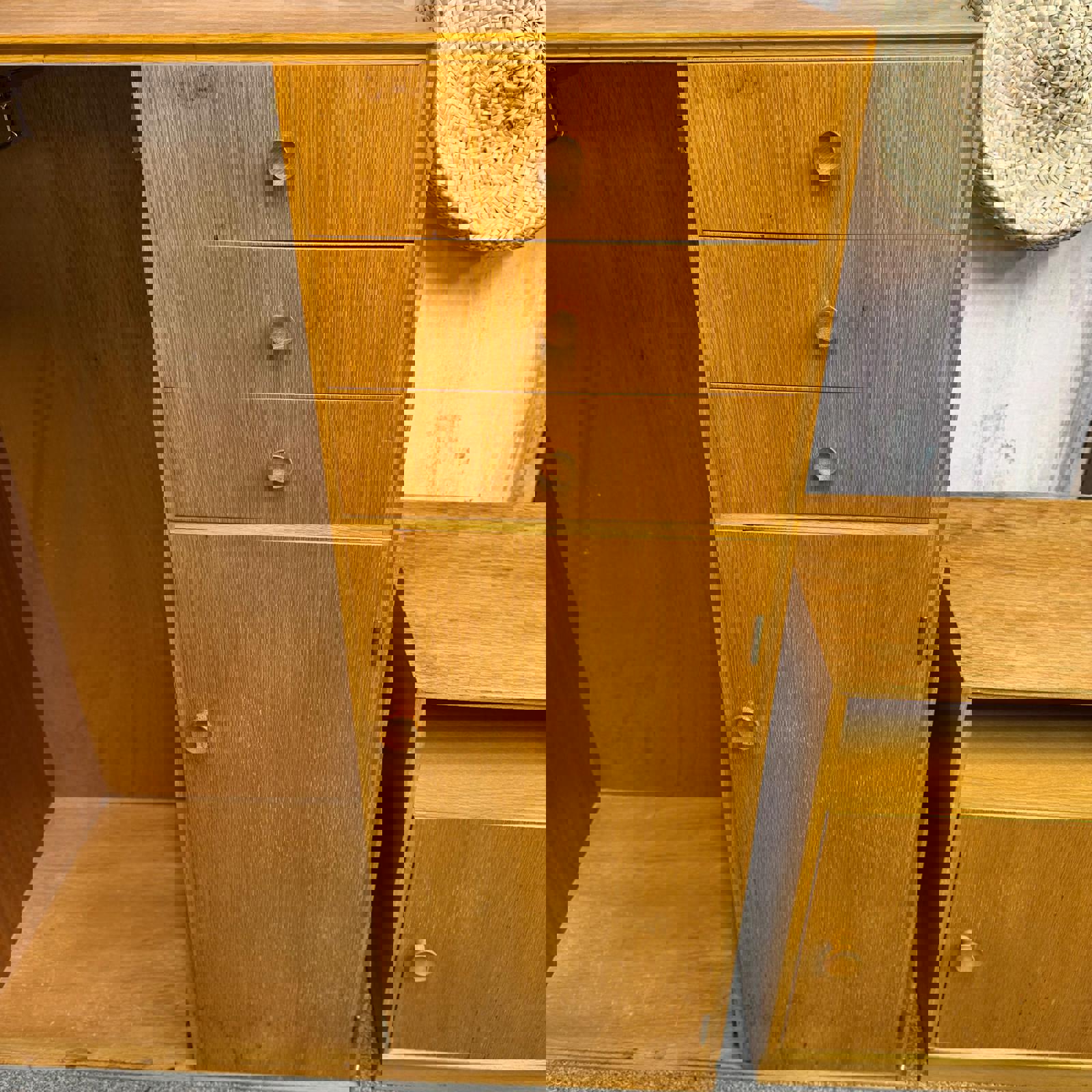 Compactum has single cupboard with sliding rail. 3 drawers on right hand side over single cupboard with 2 shelves. Top drawer has fold out piece with mirror attached.