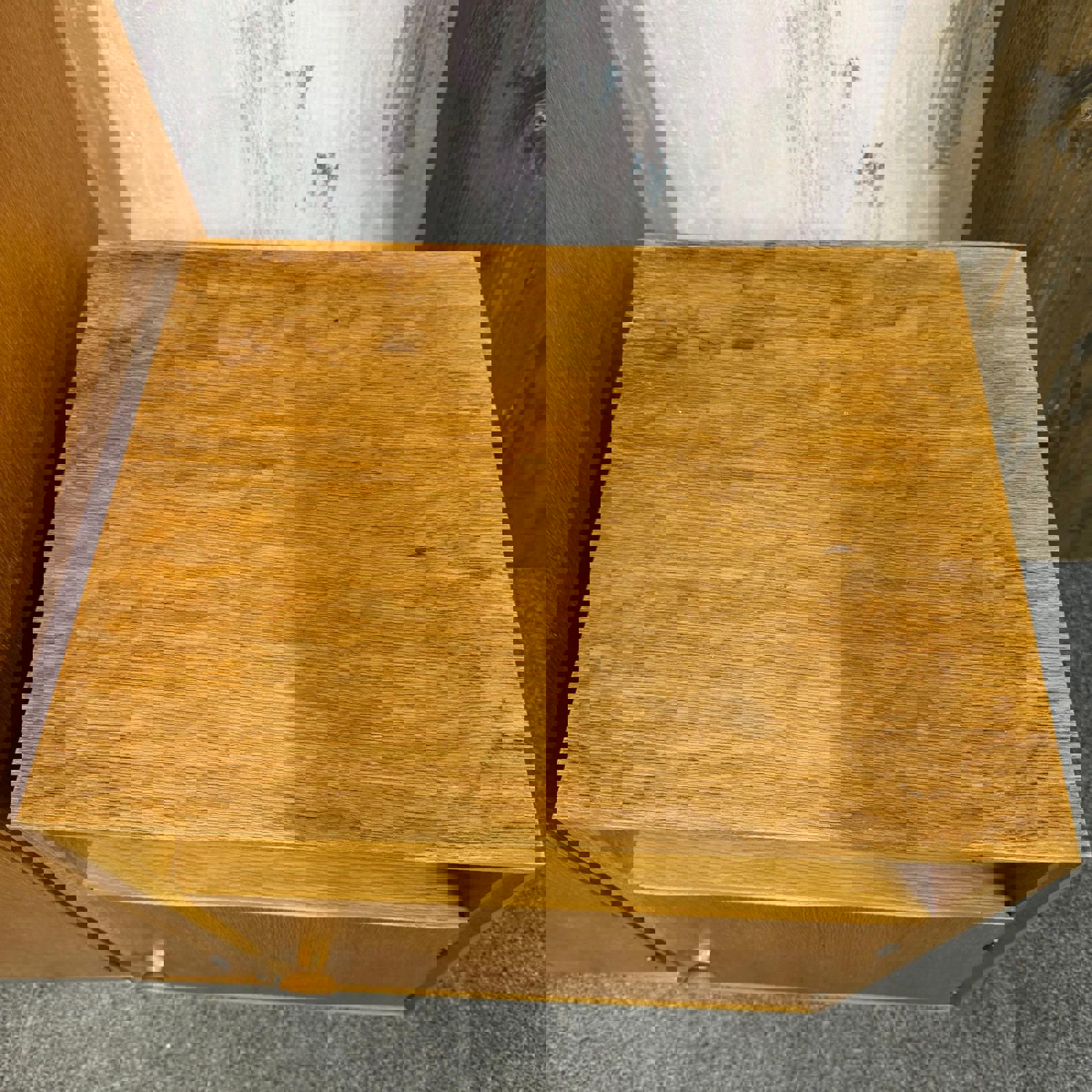 Age related across all three pieces. Some drier pieces of wood on tops. Bessie cabinet especially has water marks and more wear. Please see all pics for condition. Possible project for complete renovation.