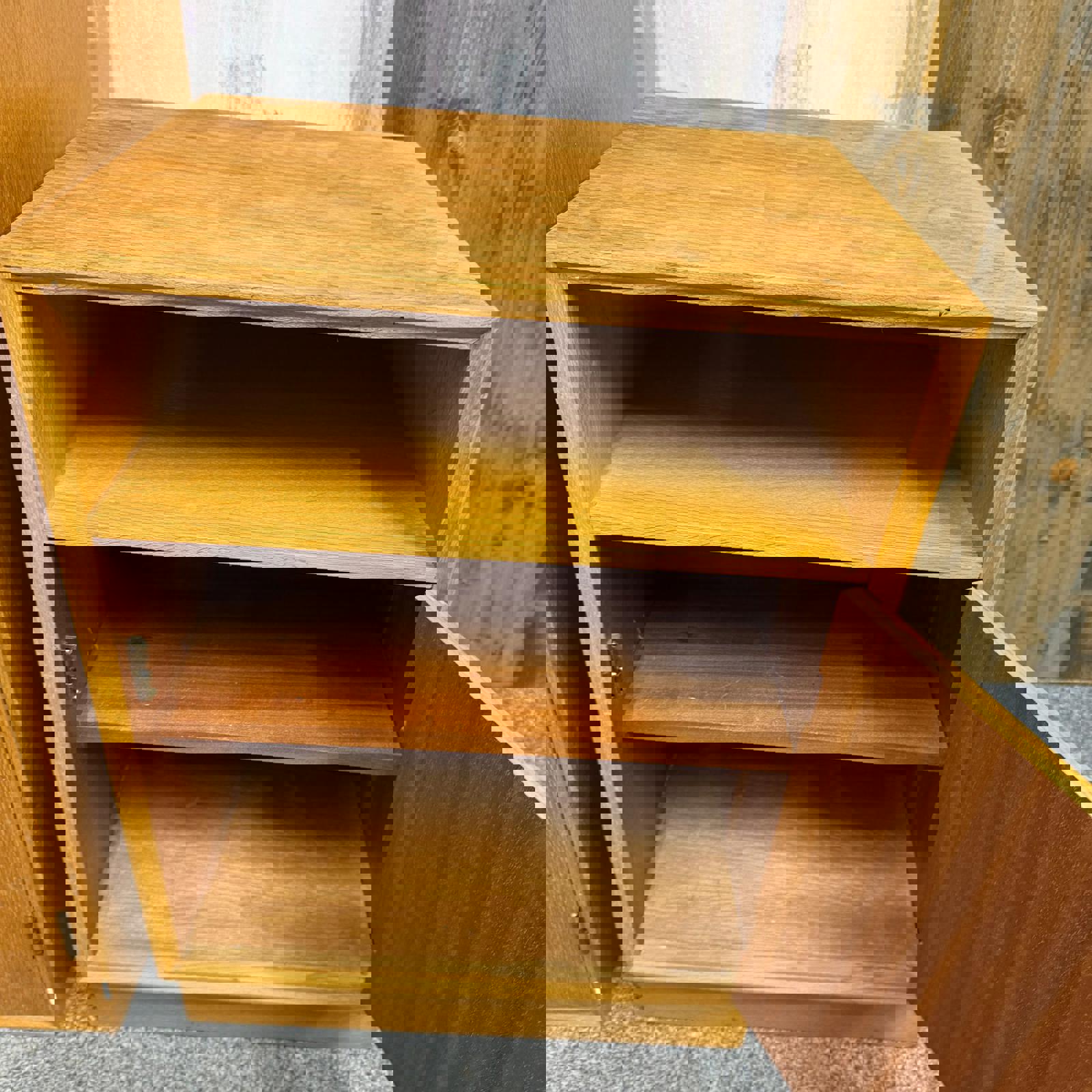 Bedside cabinet has shelf over single cupboard with one shelf.