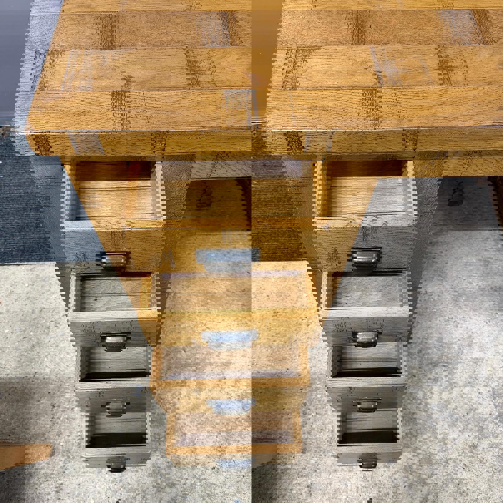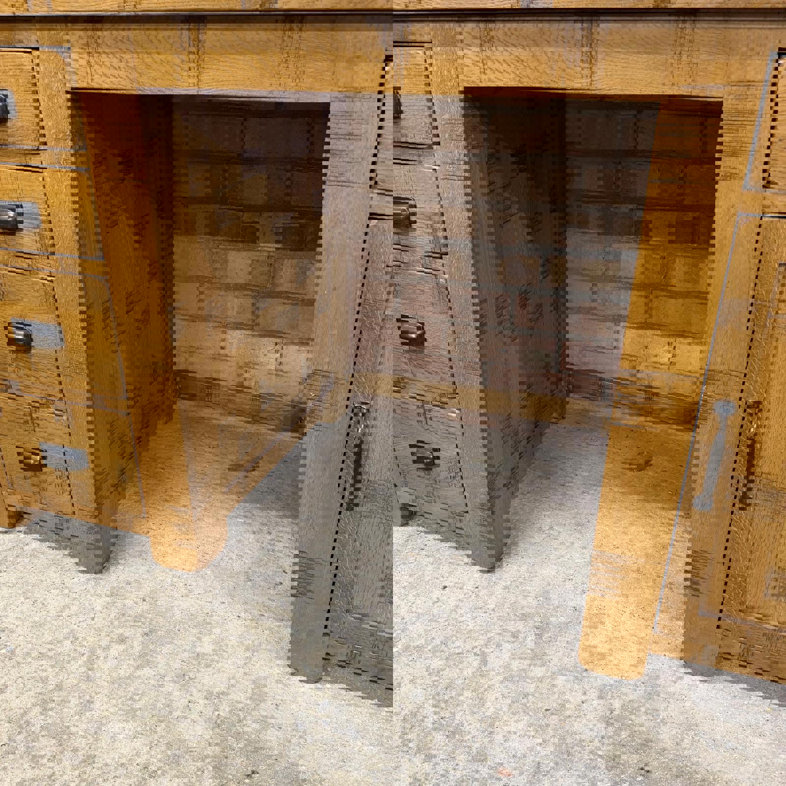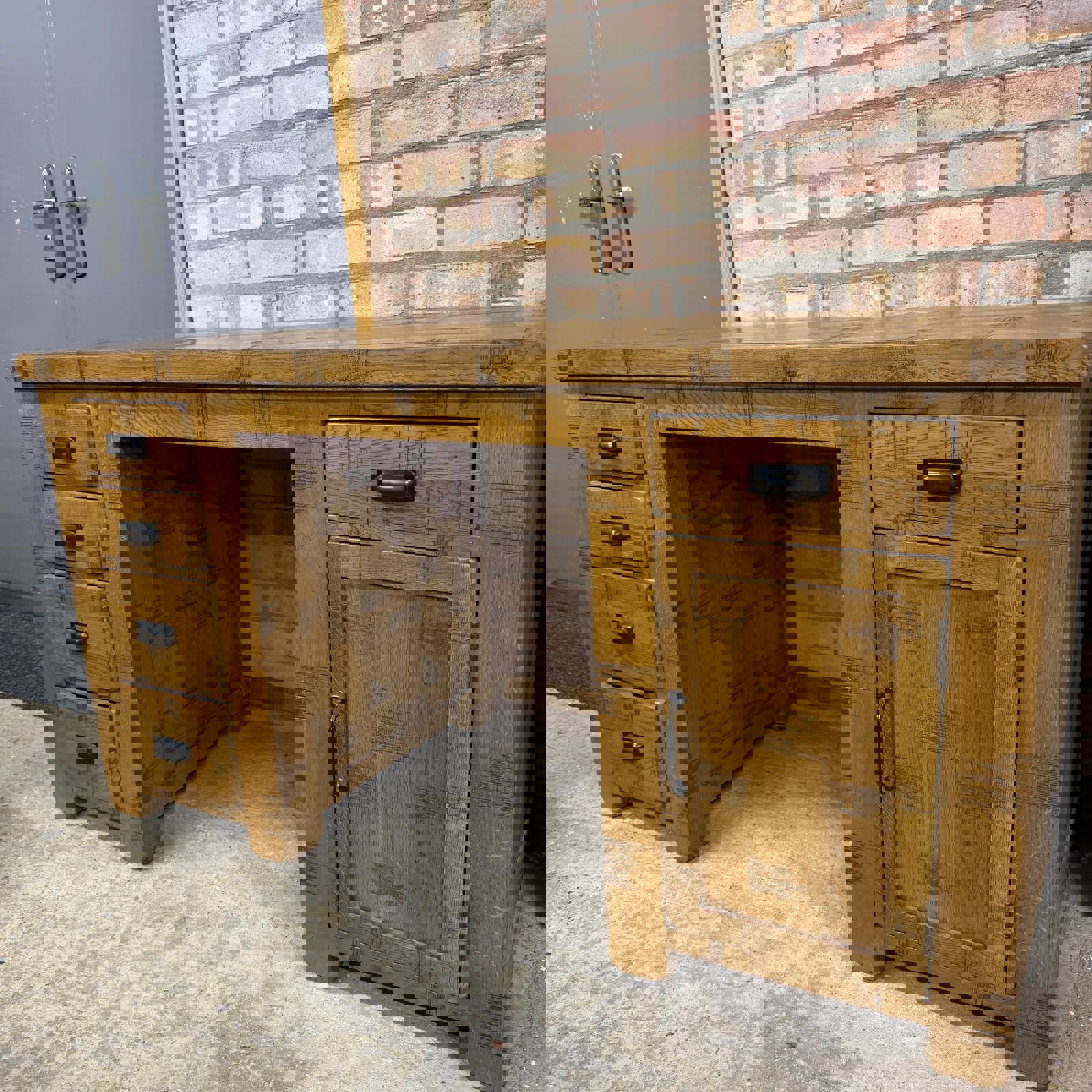 Rustic feel solid oak desk from Oak Furniture Land. Desk has 4 drawers with cup handles on left hand side and single drawer over single cupboard.