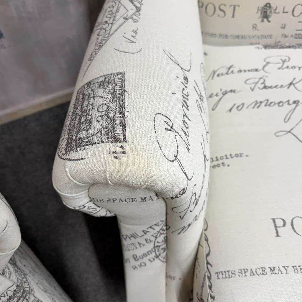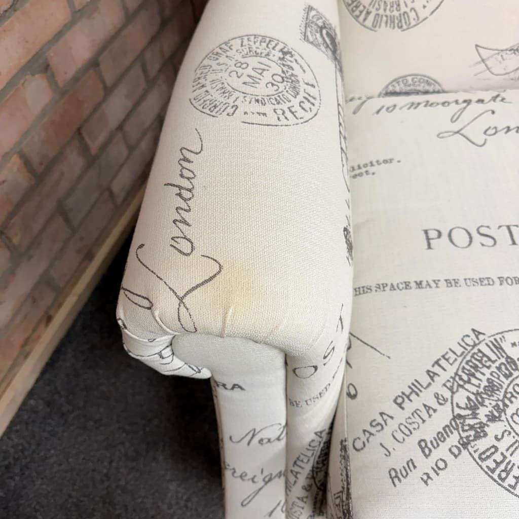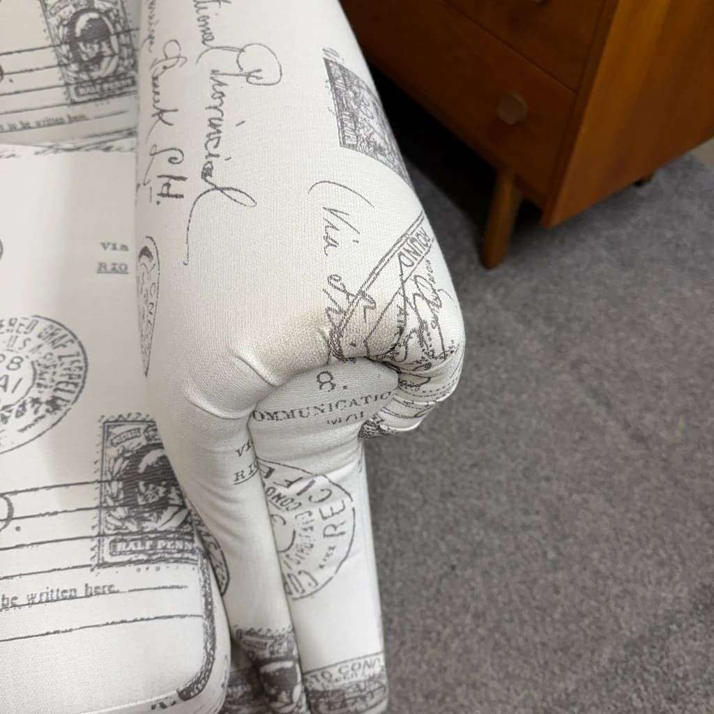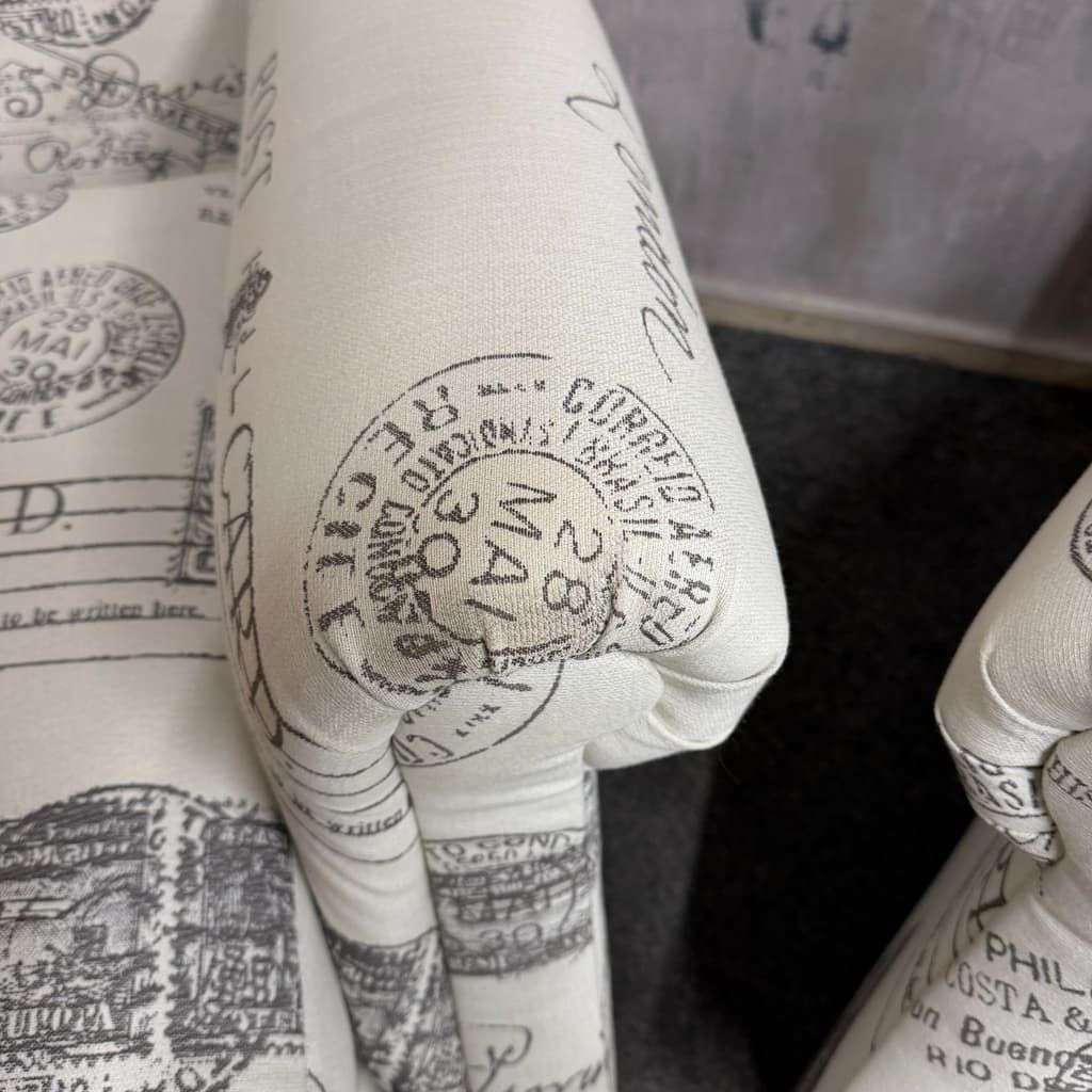 Pair Modern Upholstered Wingback Armchairs Scrolled Arms Postcard Fabric Design