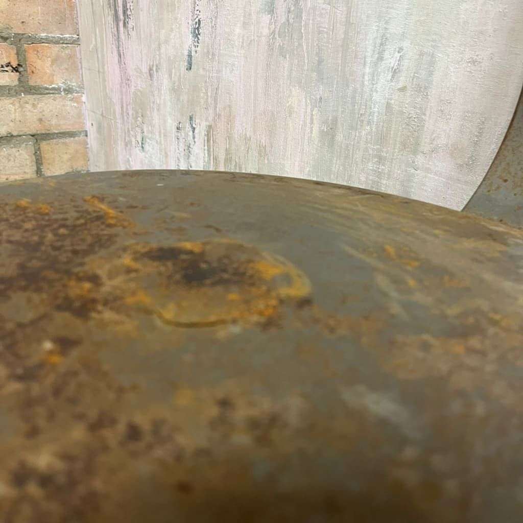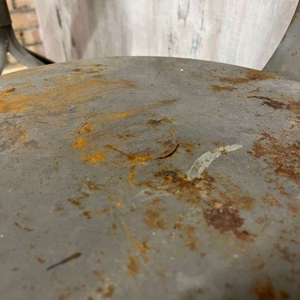 Vintage industrial chairs with back and foot rest. Adjustable seat height. Great rusted patina all over.