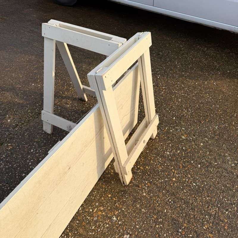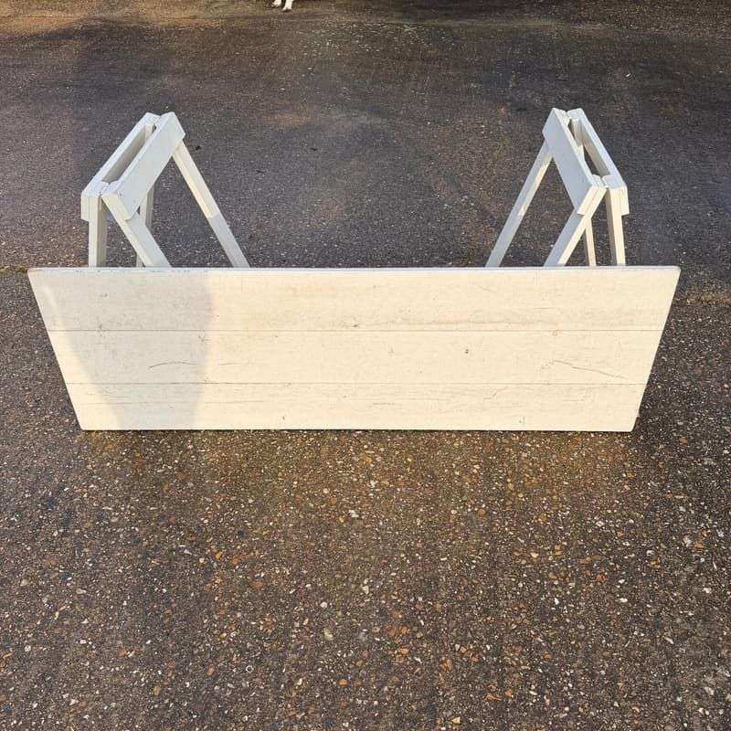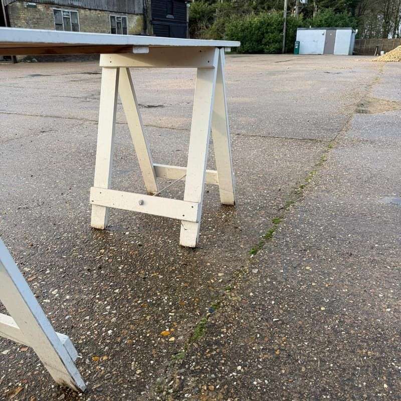 Ex shop display white wooden trestle table. Two wooden trestles with 3 plank wood top.